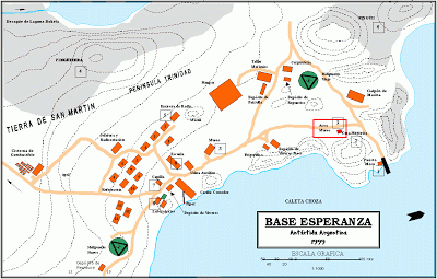 La Base Esperanza está ubicada en el extremo NE de la Península Antártica o Tierra de San Martín, a los 64° 24´ de Latitud Sur y 57° 59´ de Longitud Oeste, rodeada de imponentes glaciares como el Buenos Aires, Depósito y Arenas, montañas como el Co Taylor, Co Pirámide, Co Flora y el Estrecho Antarctic, dando un marco de singular belleza natural al lugar. Es la más septentrional de las instalaciones que nuestro país mantiene en el Territorio Antártico Argentino.